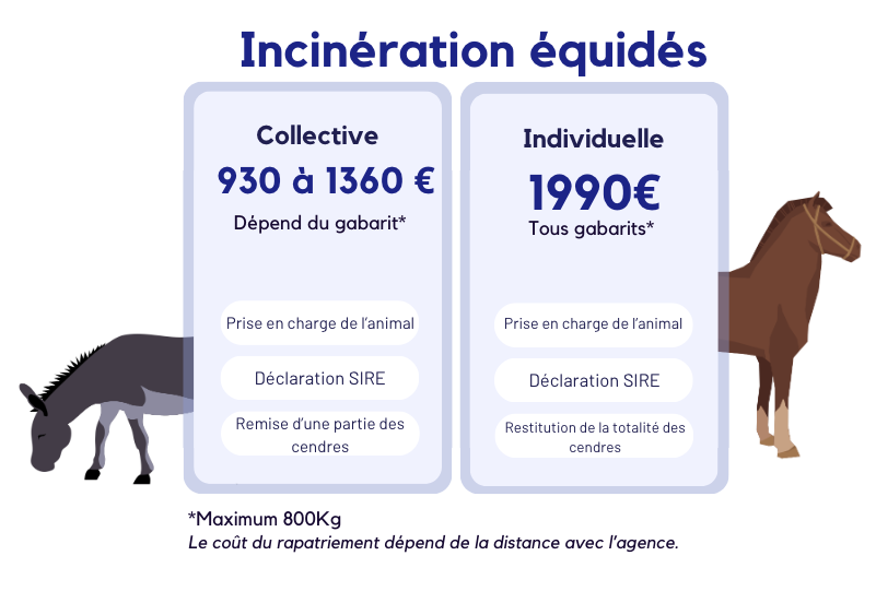 • décès au domicile : confier l'animal à un vétérinaire ou se rendre en l'agence de crémation la plus proche, appeler un service de rapatriement pour les équidés,
