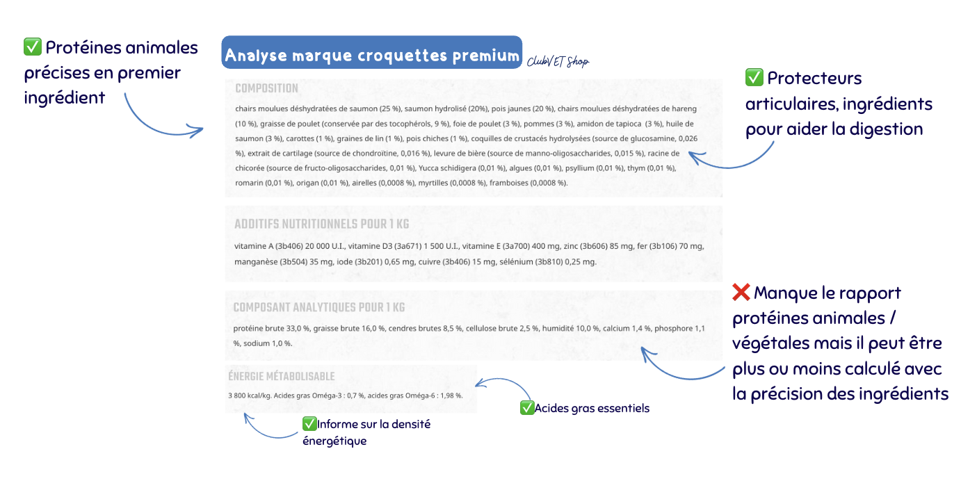 Les gammes premium et vétérinaires vont plus loin en intégrant souvent des ingrédients à visée préventive (probiotiques, antioxydants, protecteurs articulaires, etc.), qui soutiennent durablement la santé de votre compagnon.
