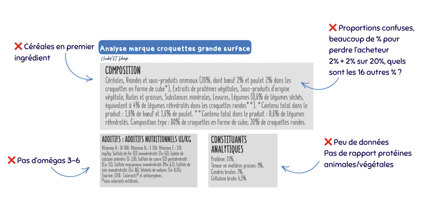 • Supermarché : digestibilité souvent faible : protéines de mauvaise qualité, trop de cendres, glucides peu digestes, etc. Cela provoque des flatulences, des selles molles, une surconsommation pour être repu.